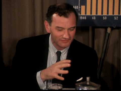 The silent footage is from the film, “Psychoactive Drugs,” and features footage of a roundtable discussion among prominent middle-aged psychiatrists and medical professionals in the 1960s, focusing on public mental hospitals and the role of psychoactive drugs in treatment. The discussion is led by Nathan S. Kline, M.D., with participants including Heinz Lehmann, M.D., and other notable experts. A yellow and blue bar graph on a stand serves as a visual aid, with the X-axis spanning from 1946 to the 1960s, likely illustrating trends or impacts related to mental health care or drug use. Sponsored by the Roerig Division of Chas. Pfizer & Co., Inc., the film emphasizes the intersection of psychiatry, medication, and institutional care during this pivotal era.