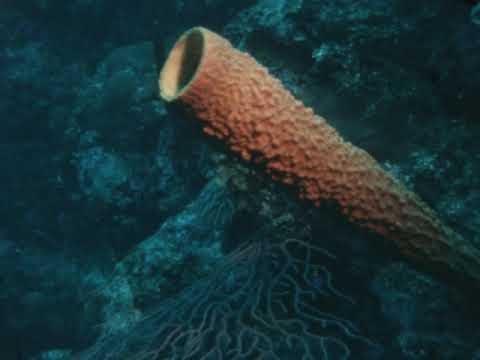 An underwater scene showcases vibrant coral formations in the South Pacific, featuring a prominent orange tube-shaped coral amidst various marine life and rocky structures.