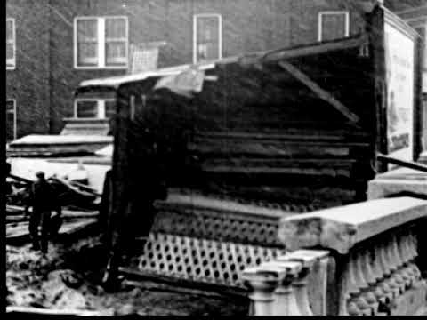 This 1936 silent newsreel documents the aftermath of the devastating Pittsburgh flood, showing both the extensive water damage and the cleanup efforts that followed. Footage includes visuals of high water levels, debris, and the extensive cleaning process involving numerous men with brooms working to restore the city. The film ends with a “The End” title card but intriguingly repeats the reel three additional times, extending its runtime.